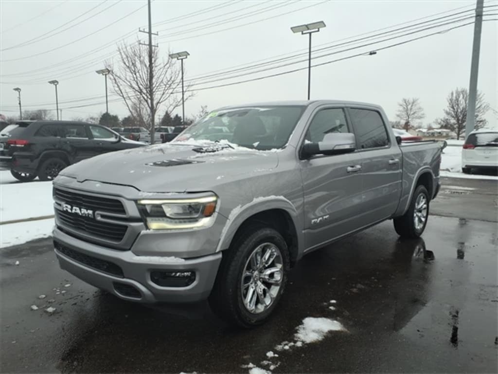 FULLY SERVICED, ONE OWNER, LOCAL TRADE, 4G LTE Wi-Fi Hot Spot, 8.4" Touchscreen Display, All R1 High Radios, All Radio Equipped Vehicles, Apple CarPlay, Auto High Beam Headlamp Control, Blind Spot & Cross Path Detection, Connected Travel & Traffic Services, Connectivity - US/Canada, Disassociated Touchscreen Display, Foam Bottle Insert (Door Trim Panel), For Details, Visit DriveUconnect.com, For More Info, Call 800-643-2112, Global Telematics Box Module (TBM), Google Android Auto, GPS Antenna Input, GPS Navigation, harman/kardon 19 Speaker Premium Sound, HD Radio, Heated Second Row Seats, Integrated Center Stack Radio, Integrated Voice Command w/Bluetooth, Laramie Level 2 Equipment Group (DISC), ParkSense Front/Rear Park Assist w/Stop, Radio: Uconnect 5 Nav w/8.4" Display, Rain Sensitive Windshield Wipers, Rear 60/40 Folding Split Recline Seat, Rear Underseat Compartment Storage, Remote Tailgate Release, SiriusXM Radio Service, SiriusXM w/360L, USB Host Flip. CARFAX One-Owner. Clean CARFAX. Certified. Billet Silver Metallic Clearcoat 2022 Ram 1500 Laramie looks like a new truck !!! Perfect condition 4D Crew Cab 4WD 8-Speed Automatic HEMI 5.7L V8 Multi Displacement VVT