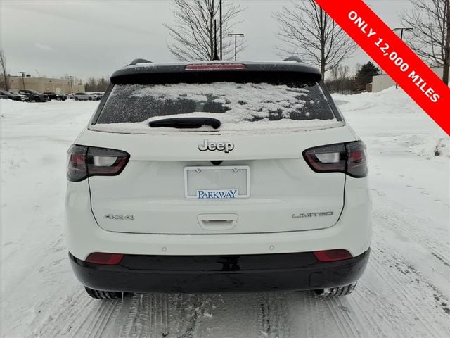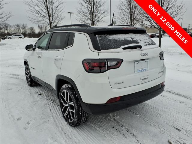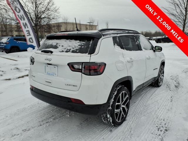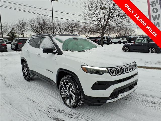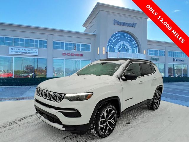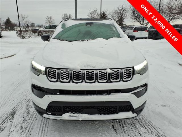 REMAINDER OF FACTORY WARRANTY, FULLY SERVICED, LOCAL TRADE, 4WD, 10.1" Touchscreen Display, 2nd Row USB Type A/C Charge Only, 360 Surround View Camera System, Active Driving Assist System, Alexa Built-In, Cluster 10.25" TFT Color Display, Connected Travel & Traffic Services, Diamond Black Door Cladding, Diamond Black Exterior Sill, Diamond Black Fascias, Diamond Black Wheel Flares, Driver Assist Group I, Driver Seat Memory, Elite Group, Foot Activated Open 'N Go Liftgate, GPS Navigation, HD Radio, Integrated Voice Command w/Bluetooth, LED Low/Highbeam Projector Headlamps, Power 2-Way Passenger Lumbar Adjust, Power 8-Way Adjust Front Passenger Seat, Power Liftgate, Premium Leather Trimmed Bucket Seats, Premium LED Fog Lamps, Premium Taillamps, Reversible Carpet/Vinyl Cargo Mat, SiriusXM w/360L, Traffic Sign Recognition, Ventilated Front Seats, Wheels: 19" x 7.5" Painted Diamond Cut Aluminum, Wireless Charging Pad. CARFAX One-Owner. Clean CARFAX. Bright White Clearcoat 2025 Jeep Compass Limited certified 12,000 miles 4D Sport Utility 4WD 8-Speed Automatic 2.0L I4 DOHC